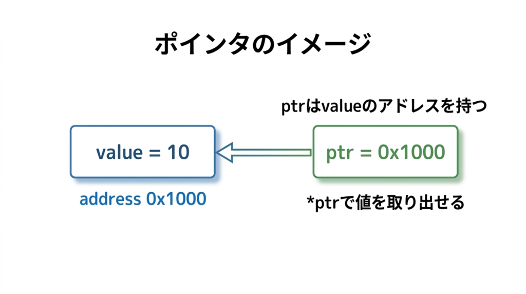 つまりポインタは、「値そのもの」ではなく「値がある住所」を扱う変数というイメージです。